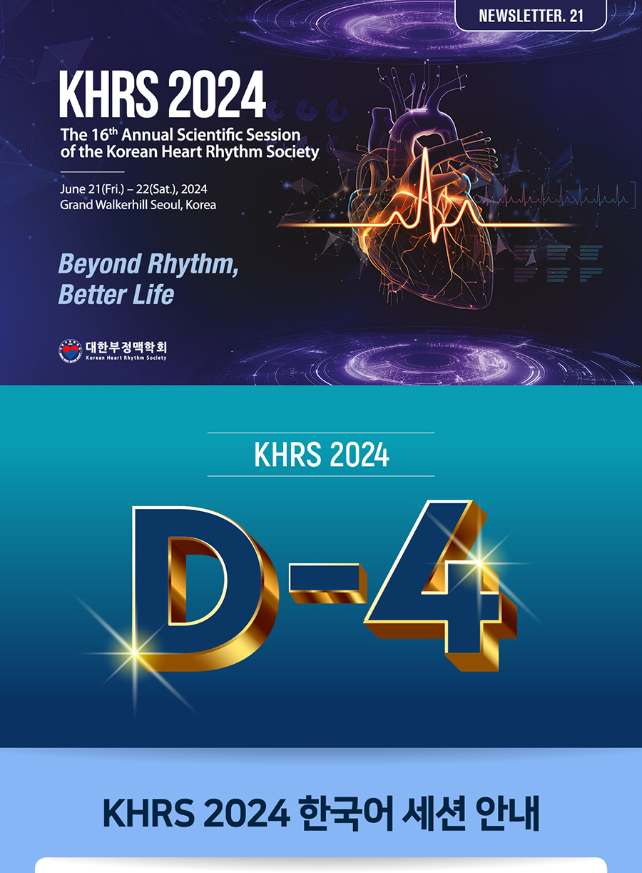News & Notice [Newsletter. 21] D-4 / 한국어 세션: Health Policy 1 & 2 Writer KHRS 2024 Date 2024-06-17 Hits 727 Next [Newsletter. 22] (★D-3) Welcome to KHRS 2024: Upcoming Events and Highlights / How to Receive Your Name Badge 2024.06.18 Previous [Newsletter. 20] D-7 of KHRS 2024 /Join us for our Tokyo-Taipei-Seoul Arrhythmia Joint Conference 2024 2024.06.14 List